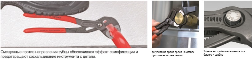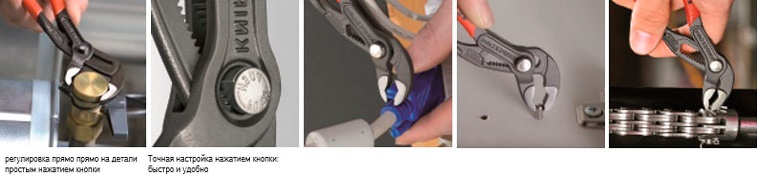 Клещи сантехнические KNIPEX-aquot;Cobra" модель Hightech. Нет больше проблем с настройкой раствора губок. Вместо этого: верхнюю губку клещей установить на деталь, нажать кнопку и придвинуть нижнюю губку. Гениально просто.